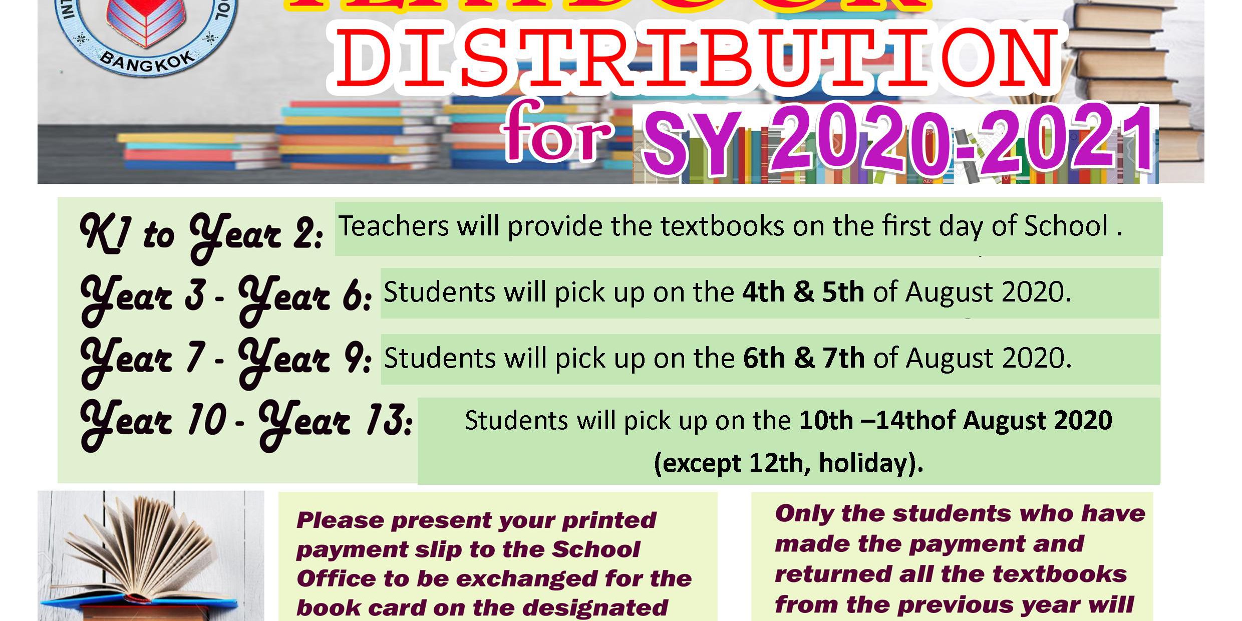 Please present your printed payment slip to the School Office to be exchanged for the book card on the designated dates for book pick-up for your Year level.